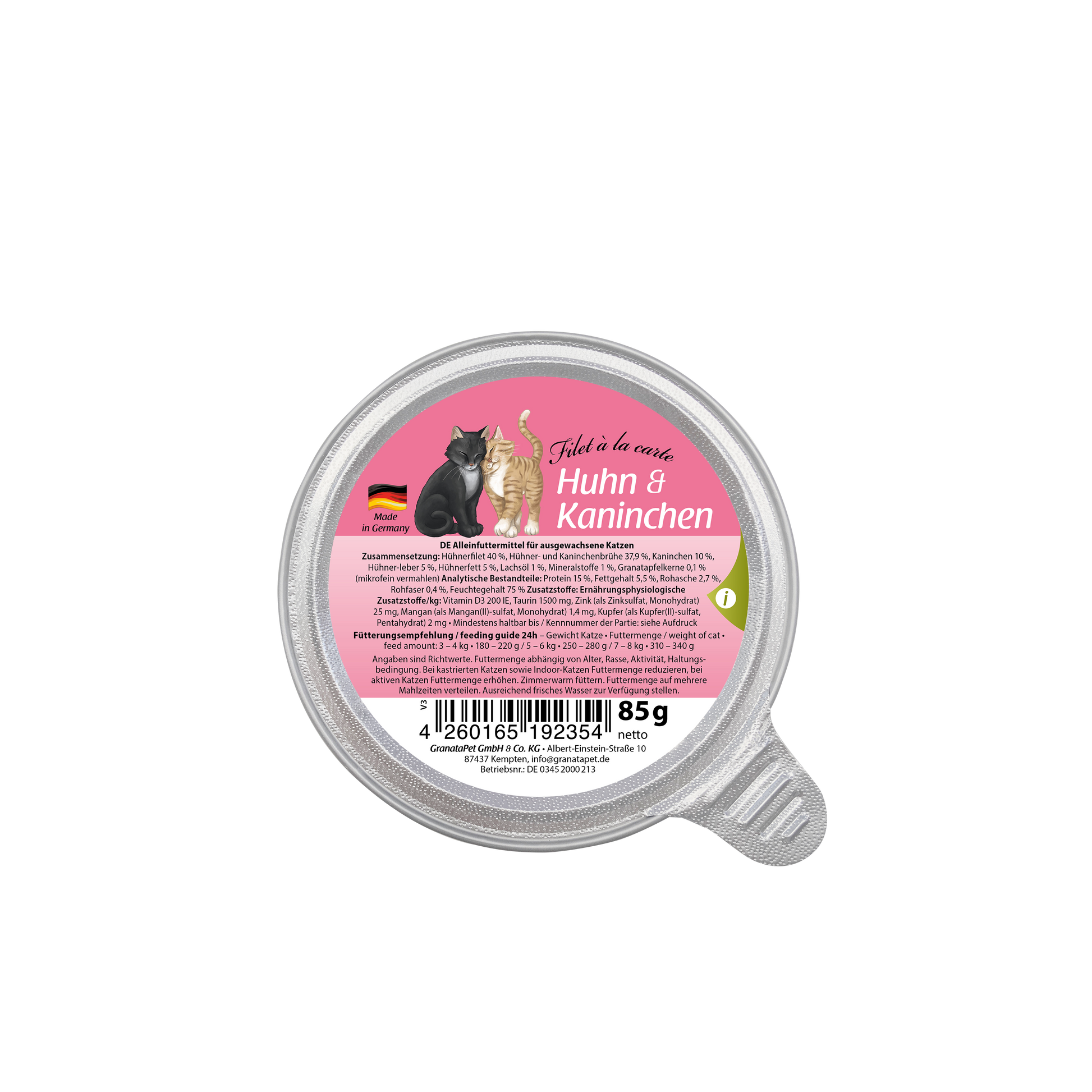 GranataPet Filet à la carte wet food is a delicious whole-food recipe made with tender chunks of fillet. The recipe is enriched with high-quality salmon oil and pomegranate seeds. Gently cooked in its own juices, this premium-quality natural wet food is especially flavoursome and easy to digest. The salmon oil protects your cat’s skin and ensures a silky, glossy coat. The product also contains minerals, taurine and other vitalising ingredients to make this succulent recipe into a balanced whole-food.