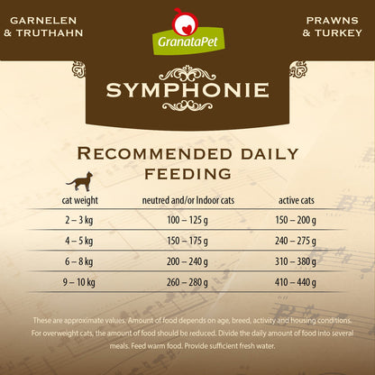 GranataPet Symphonie is a balanced, complete wet food for cats and contains an especially generous serving of meat. The tender chunks of fillet are delicately blanched and gently cooked during packaging. The cooking process produces the natural jelly, which contains precious nutrients and is enjoyed as a real delicacy by cats. This gentle production process preserves important vitamins, nutrients and essential fatty acids. The high meat content (made up exclusively of lean meat and liver) is enriched with premium-quality salmon oil and pomegranate seeds.