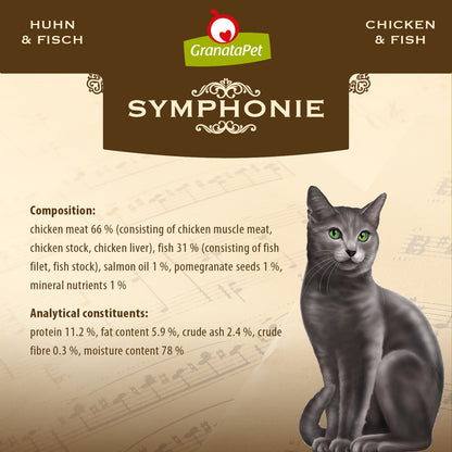GranataPet Symphonie is a balanced, complete wet food for cats and contains an especially generous serving of meat. The tender chunks of fillet are delicately blanched and gently cooked during packaging. The cooking process produces the natural jelly, which contains precious nutrients and is enjoyed as a real delicacy by cats. This gentle production process preserves important vitamins, nutrients and essential fatty acids. The high meat content (made up exclusively of lean meat and liver) is enriched with premium-quality salmon oil and pomegranate seeds.