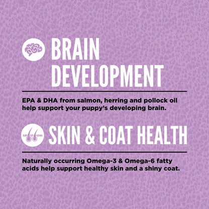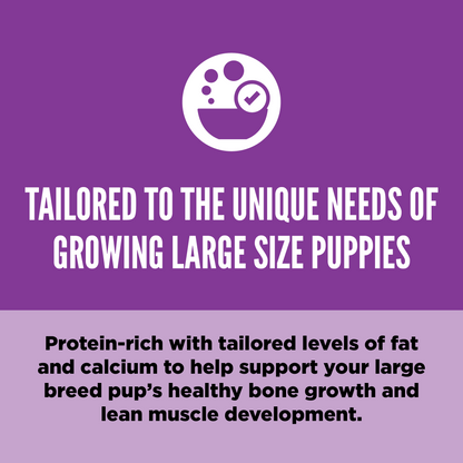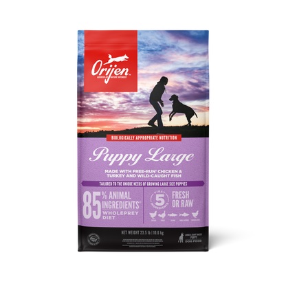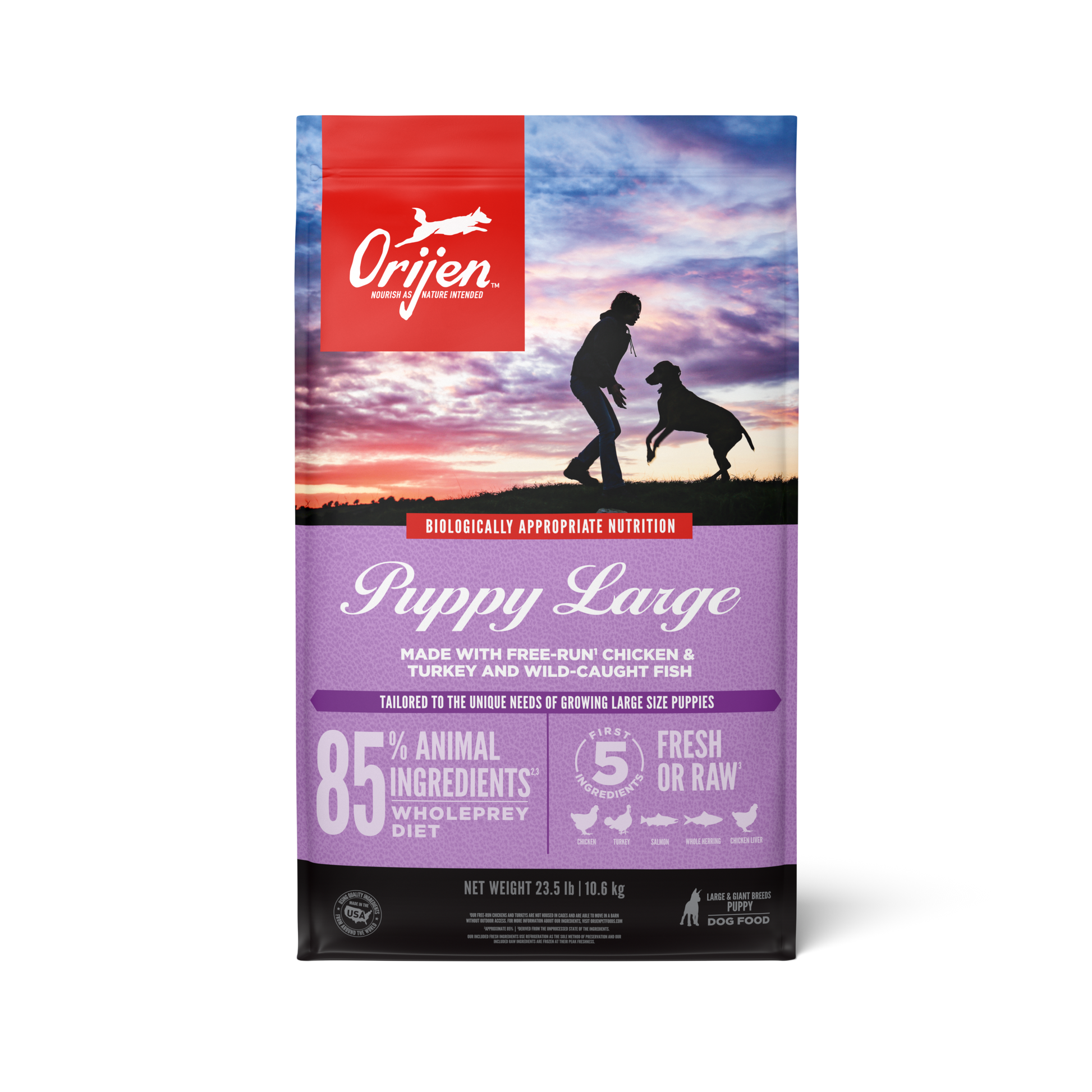 Help your puppy thrive with the power of protein-rich recipes that provide peak nourishment. All large breed puppies do best on a Biologically Appropriate diet rich in protein and fat from quality animal ingredients to support peak development. ORIJEN™ Puppy Large diet is made with 85% quality animal ingredients, including fresh or raw chicken and turkey, and wild-caught or sustainably farmed fish. Packed with WholePrey animal ingredients, such as organs and bones, ORIJEN™ food is made with the most nutrient-dense, succulent parts of the prey to deliver the nutrition puppies need. The result is a diet for your canine companion that is beyond comparison.