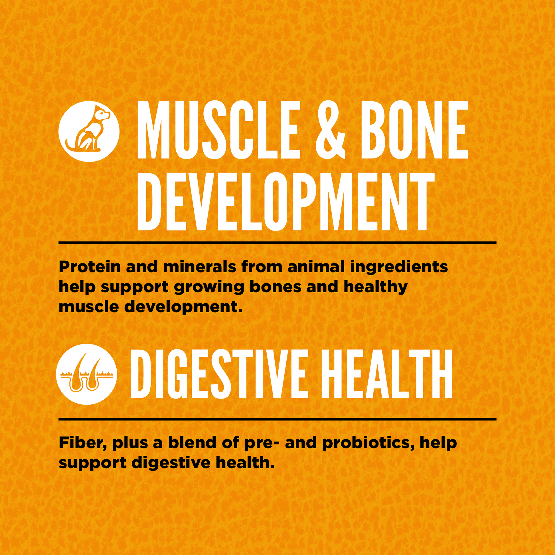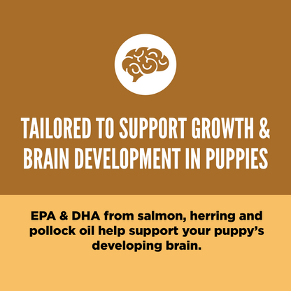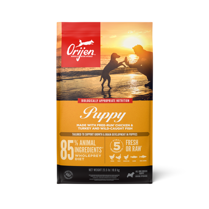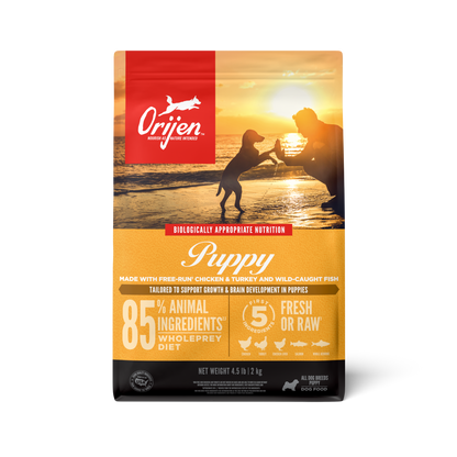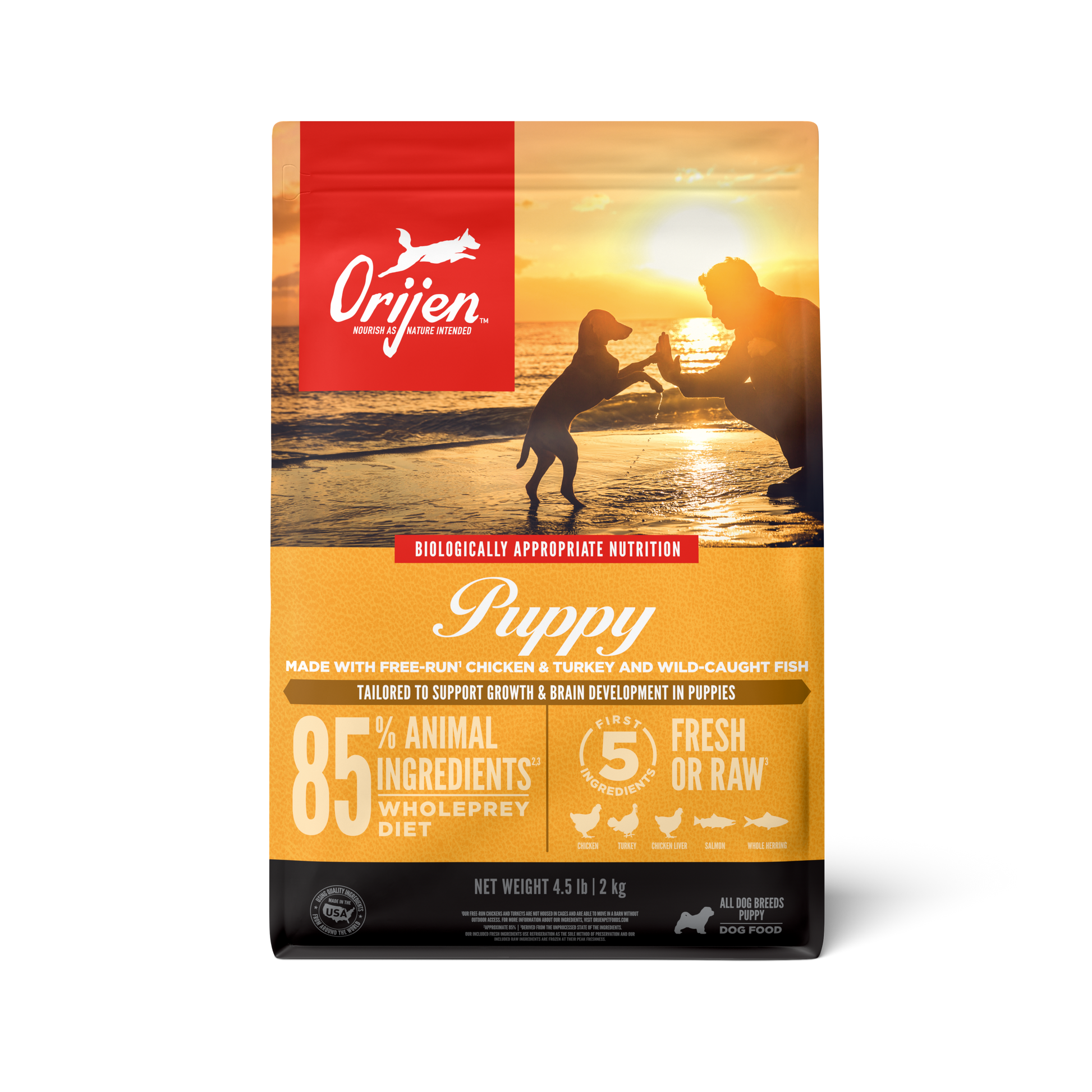 Help your puppy thrive with the power of protein-rich recipes that provide peak nourishment. All puppies do best on a Biologically Appropriate diet rich in protein and fat from quality animal ingredients to support their development. ORIJEN™ Puppy diet is made with 85% quality animal ingredients , including fresh or raw chicken and turkey, and wild-caught fish. Packed with WholePrey animal ingredients, such as organs and bones, ORIJEN™ food is made with the most nutrient-dense, succulent parts of the prey to deliver the nutrition puppies need. The result is a diet for your canine companion that is beyond comparison.