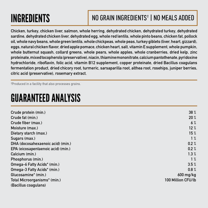 Crude protein 38% min, Crude fat 20% min, Crude fiber 6% max, Moisture 12% max, Dietary Starch 15% max, Sugars 1% max, DHA (docosahexaenoic acid) 0.2% min, EPA (eicosapentaenoic acid) 0.2% min, Calcium 1.3% min, Phosphorus 1% min, Omega-6 fatty acids* 3.5% min, Omega-3 fatty acids* 0.8% min, Glucosamine* 600 mg/kg min, Total Microorganisms* 100 Million CFU/lb, (Bacillus coagulans), *Not recognized as an essential nutrient by the AAFCO Dog Food Nutrient Profiles.