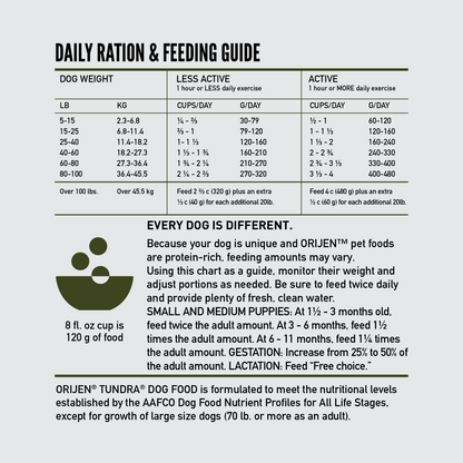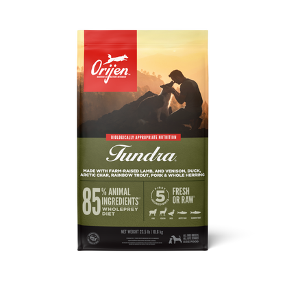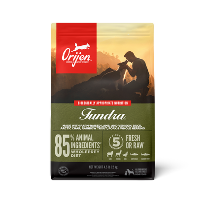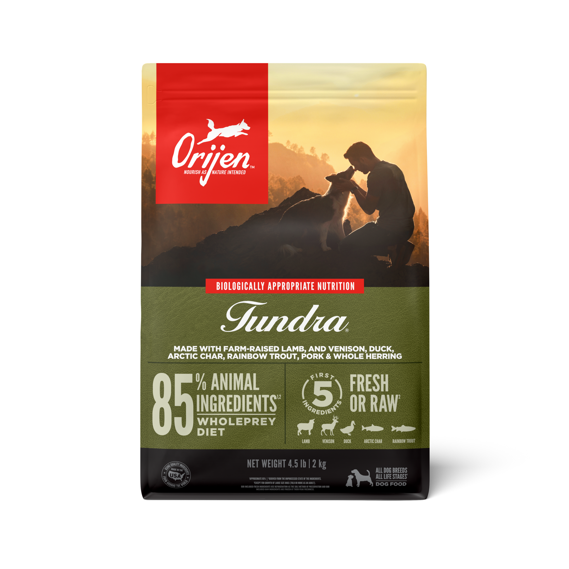 Help your dog thrive with the power of protein-rich recipes that provide peak nourishment. Dogs are ancestral carnivores, so they need a Biologically Appropriate diet rich and varied in whole animal ingredients. ORIJEN™ Tundra diet is made with 85% quality animal