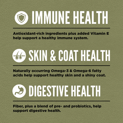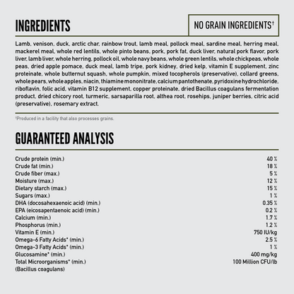 Crude protein 40% min, Crude fat 18% min, Crude fiber 5% max, Moisture 12% max, Dietary Starch 15% max, Sugars 1% max, DHA (docosahexaenoic acid) 0.35% min, EPA (eicosapentaenoic acid) 0.2% min, Calcium 1.7% min, Phosphorus 1.2% min, Omega-6 fatty acids* 2.5% min, Omega-3 fatty acids* 1% min, Glucosamine*400 mg/kg min, Total Microorganisms* 100 Million CFU/lb, (Bacillus coagulans), Vitamin E(min) 750 IU/kg *Not recognized as an essential nutrient by the AAFCO Dog Food Nutrient Profiles.