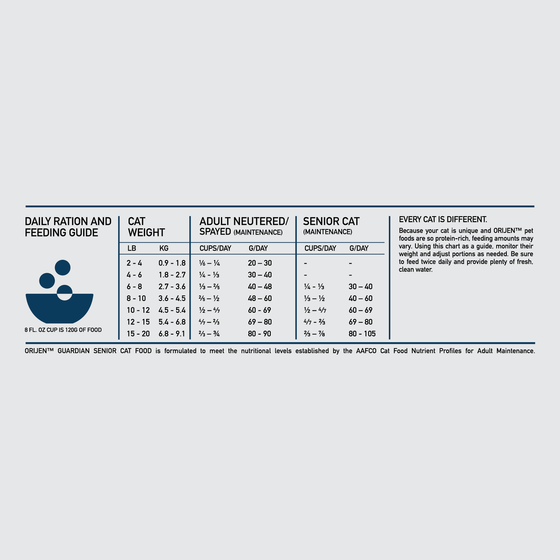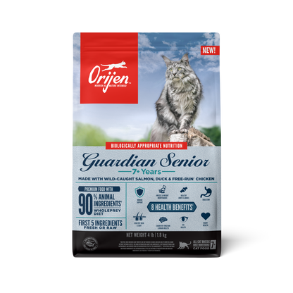 ORIJEN™ GUARDIAN™ Senior is crafted for senior cats aged 7+ to support their vitality and well-being. Made with 90% quality animal ingredients, and 2/3 of those being fresh or raw, this diet provides the protein your mature cat needs to thrive. With nutrient-dense WholePrey inclusions, GUARDIAN™ Senior supports your senior cat’s immune and digestive system, supports a healthy skin and coat, helps to maintain muscle, joint and heart health, supports cognitive function and brain health, as well as eye health. Help your senior cat thrive with GUARDIAN™ Senior diet for cats aged 7+.